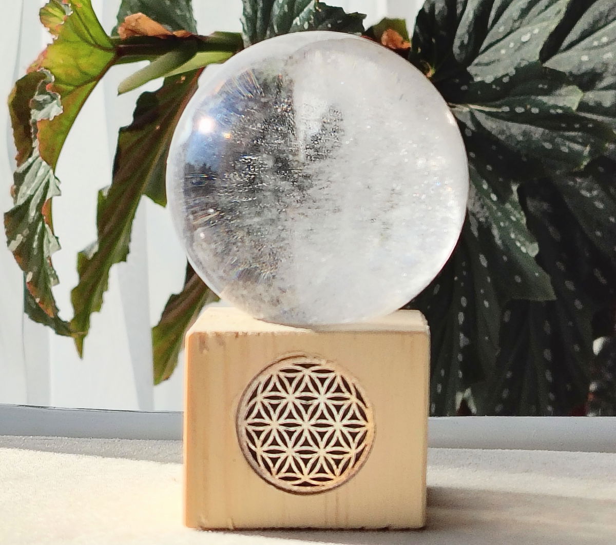 Esfera de Cuarzo Cristal (incluye base de madera con simbolo flor de la vida)