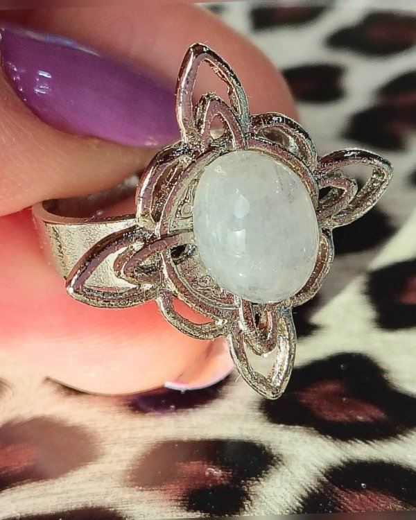Anillos de acero con base de fundición de Nudo de Bruja con piedra natural Adularia arcoíris (Piedra de la Luna).