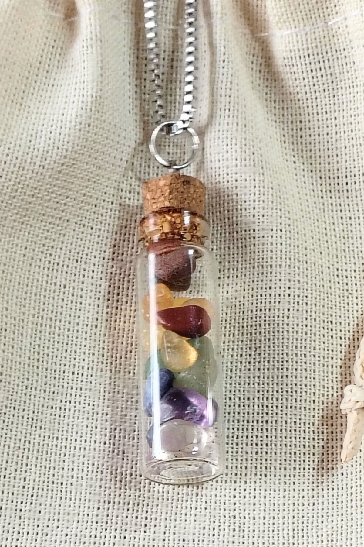 Este dije ( de 4 cm de alto x 1 cm de ancho) está compuesto por una botellita de vidrio transparente, con tapón de corcho. Lo acompaña una cadena de acero quirúrgico de 50 cm de largo. Esta cuidadosamente rellena con pequeñas piedras naturales, símbolo de paz, desbloqueo y equilibrio espiritual.