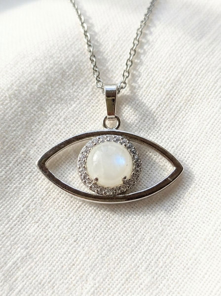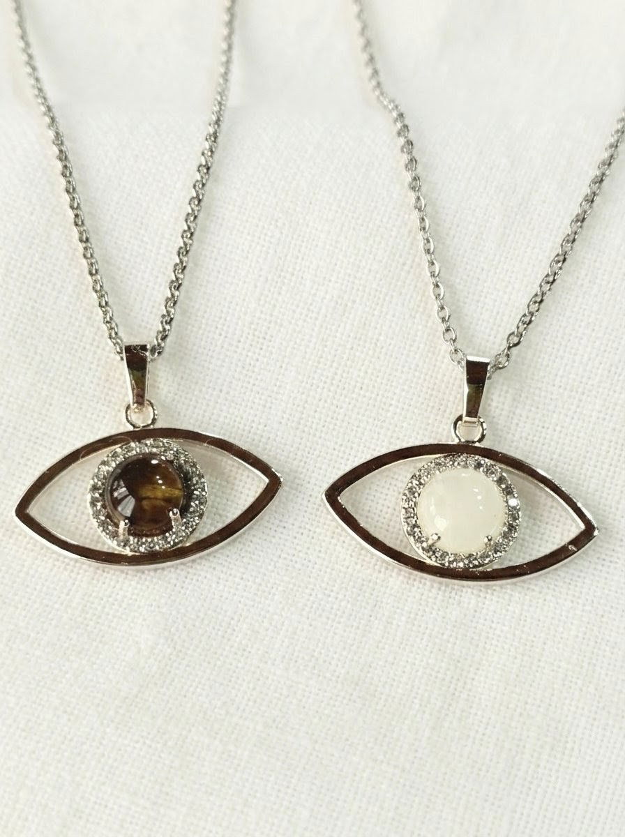 Este collar de acero de 45 / 50 cm es una pieza única que combina elegancia y significado. Su dije en forma de ojo, bañado en plata y con Strass se complementa con un hermosa piedra de Ojo de Tigre u Opalina Lunar.