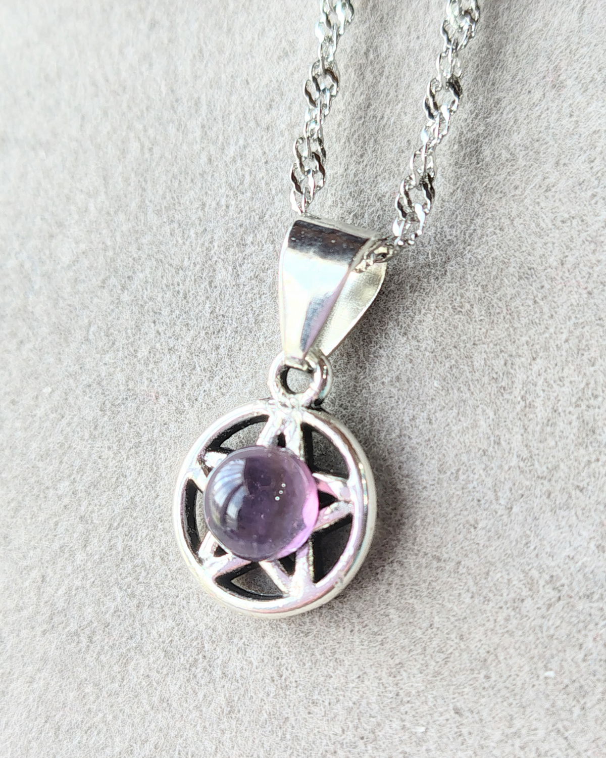Amatista: Es una piedra muy poderosa y protectora. Tranquilizante natural que ayuda a bloquear las energías ambientales negativas. Limpia el aura y transmuta la energía negativa además de estimular los chacras de la garganta y coronilla.