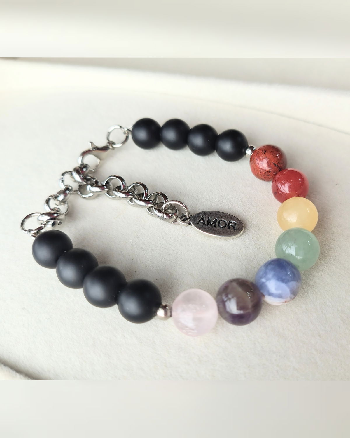 Pulsera de piedras naturales siete chakras y roca volcánica.