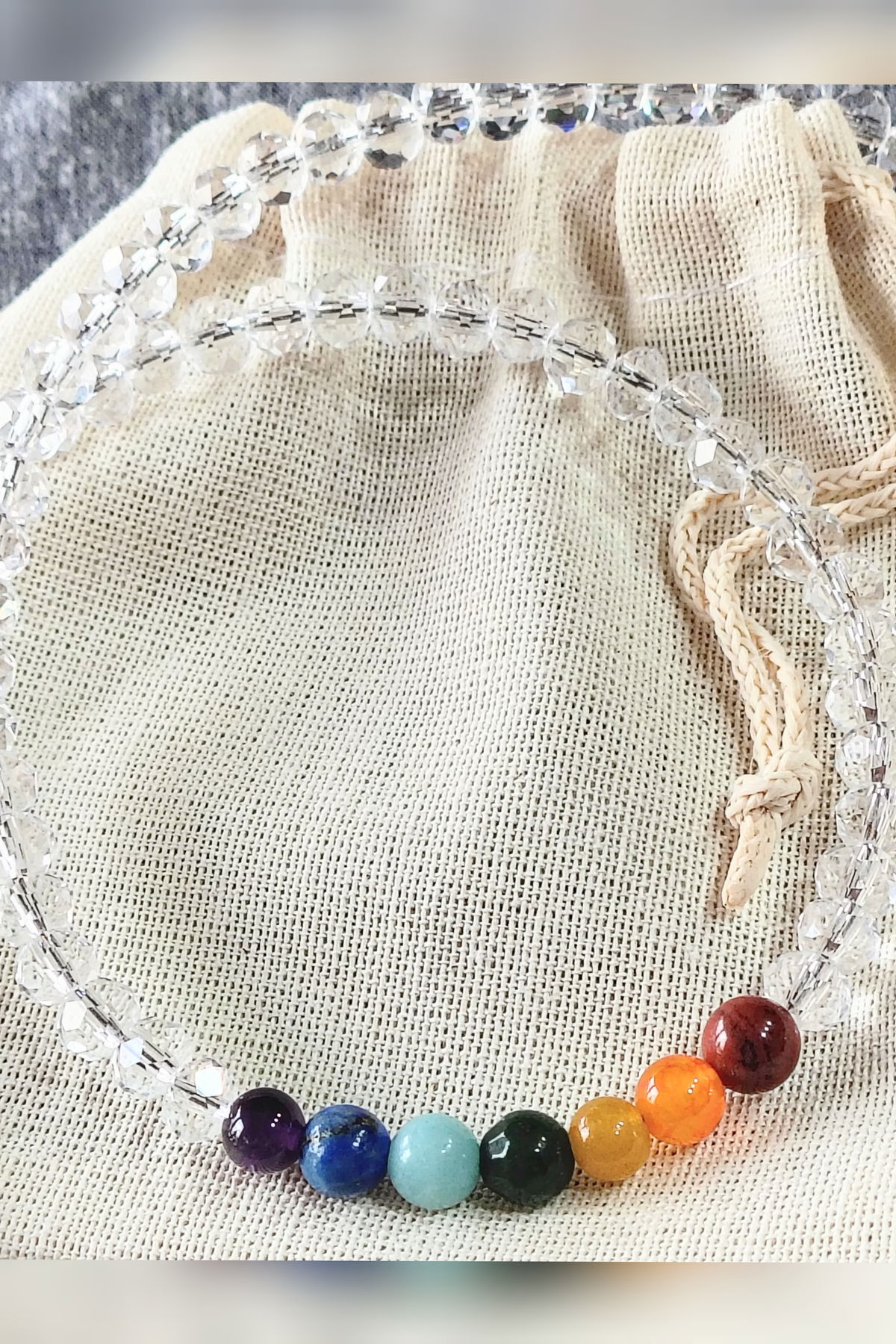 Realizada con piedras Jaspe rojo/ Ágata naranja/ Calcita amarilla/ Cuarzo verde/ Amazonita y Amatista de 6mm + cristal de vidrio transparente.