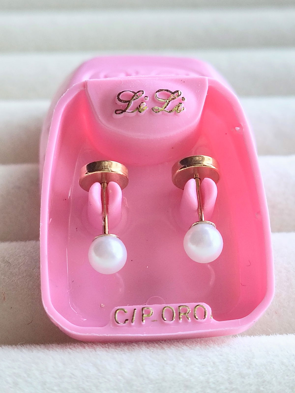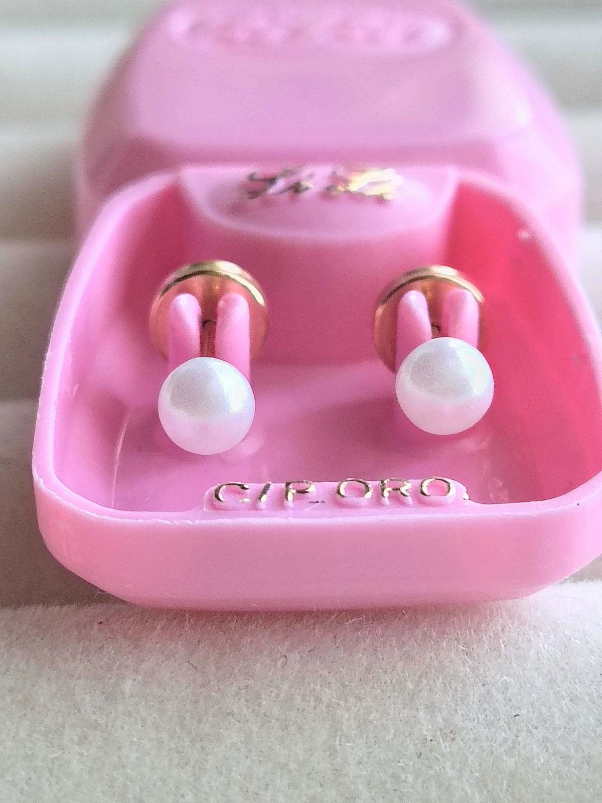 La cajita rosa son, solo el perno es de Oro 18k, con el fresnte y el tic traba hueca laminada de Oro 18k