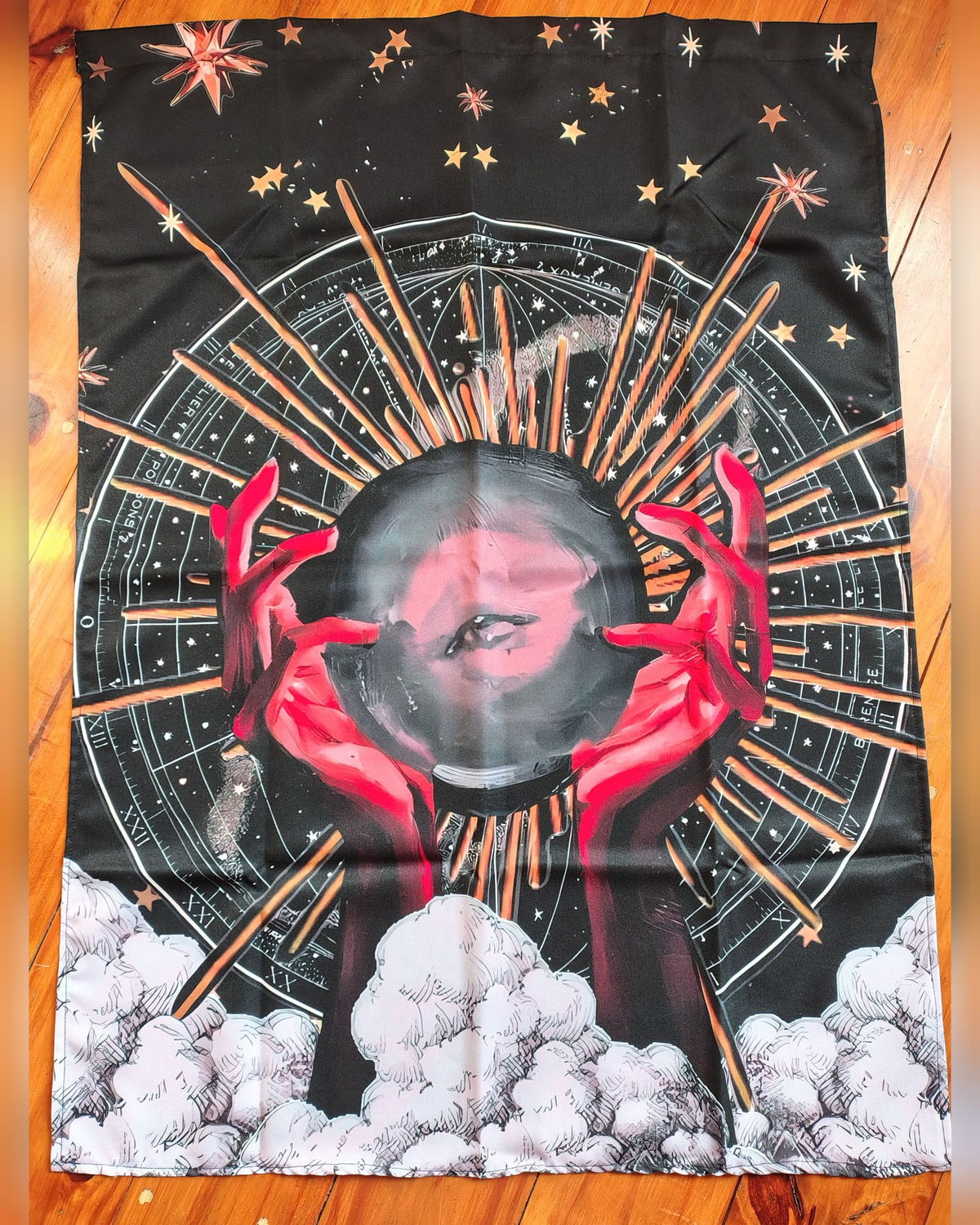 Transforma cualquier rincón de tu hogar en un espacio lleno de energía y significado con nuestro tapiz de pared con diseño colorido de elementos esotéricos. Ideal para Añadir un toque místico y único a tu espacio, inspirado en las cartas del tarot El Sol, La Rueda de la Fortuna, El Ermitaño y el Tres de Espadas. Cada una de estas cartas ha sido elegida por su profundo simbolismo, representando la iluminación, los ciclos de la vida, la introspección y los desafíos emocionales.